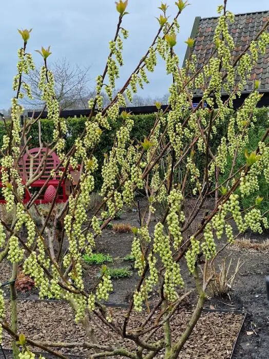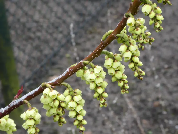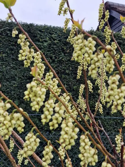 Stachyurus praecox var. Le Matsuzakii reste plus bas et fleurit avec des grappes suspendues d’un blanc crème.