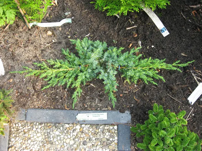 Juniperus squamata 'Blue Swede' est un genévrier bleu-vert avec une couleur plus bleu-gris en hiver.