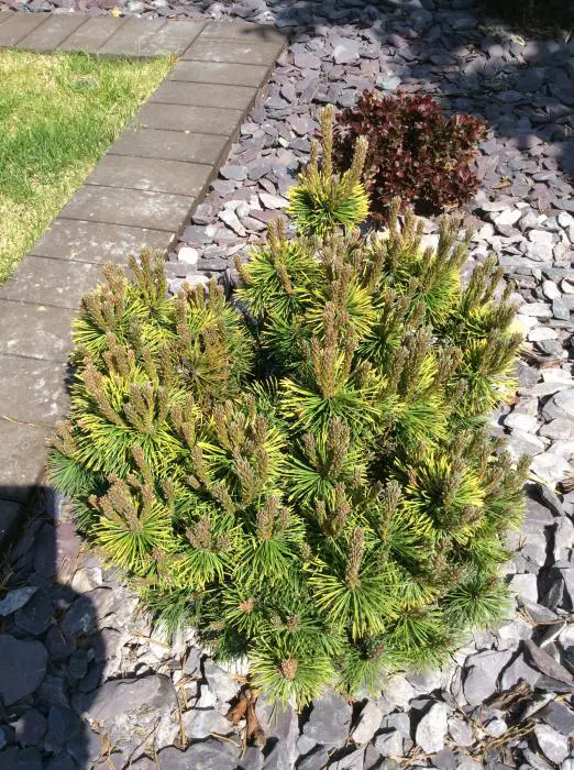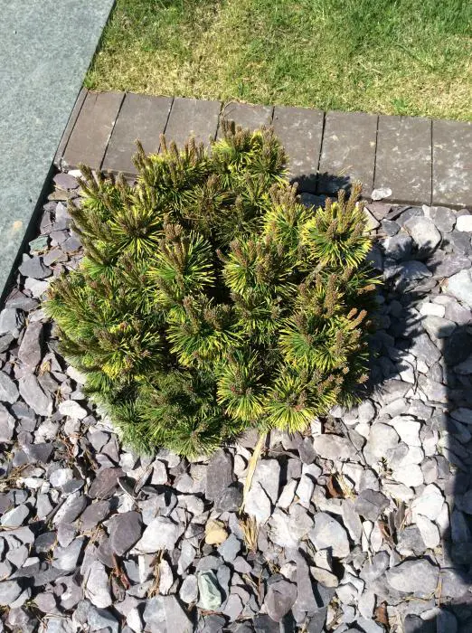 Pinus mugo 'Ophir' est un conifère sphérique compact avec un sommet aplati et des aiguilles jaune-vert à jaune.