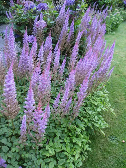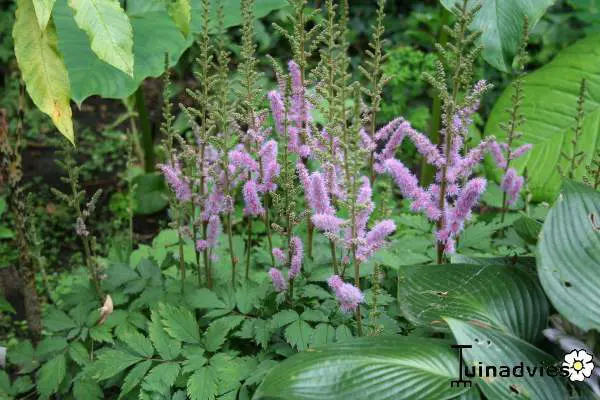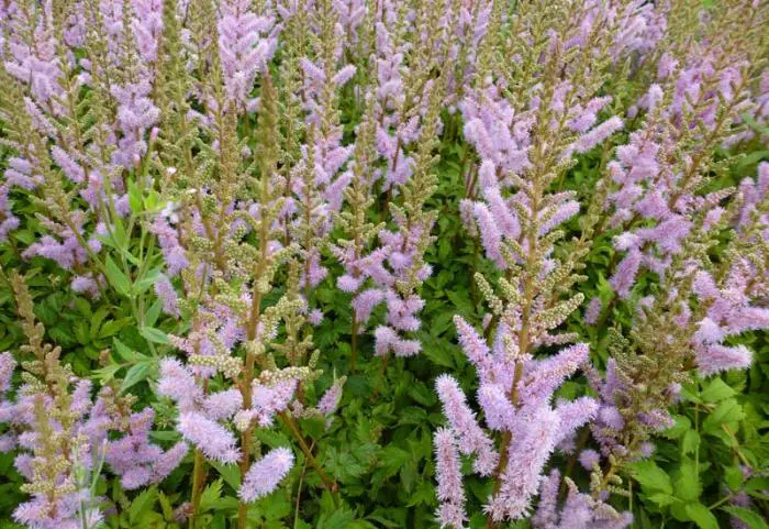 Astilbe chinensis 'Pumila' n’est pas très grande (30 cm) mais fleurit longtemps avec de grandes panicules aériennes, d’un rose violet clair.