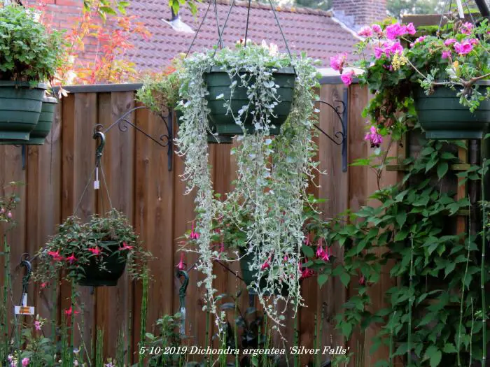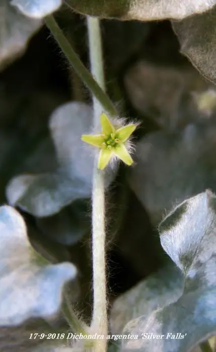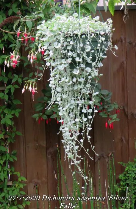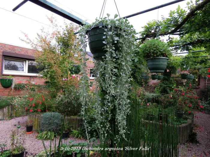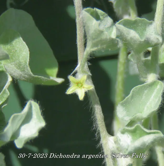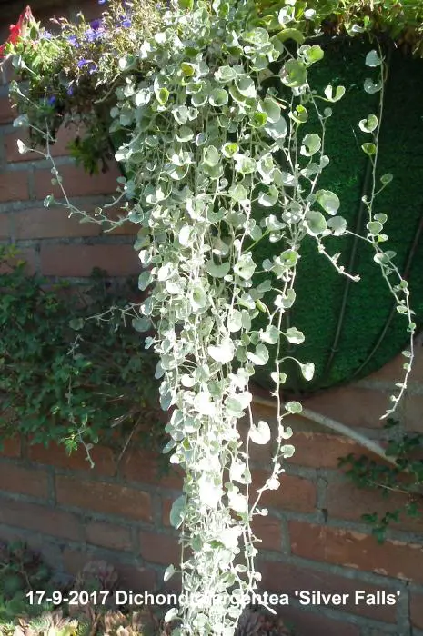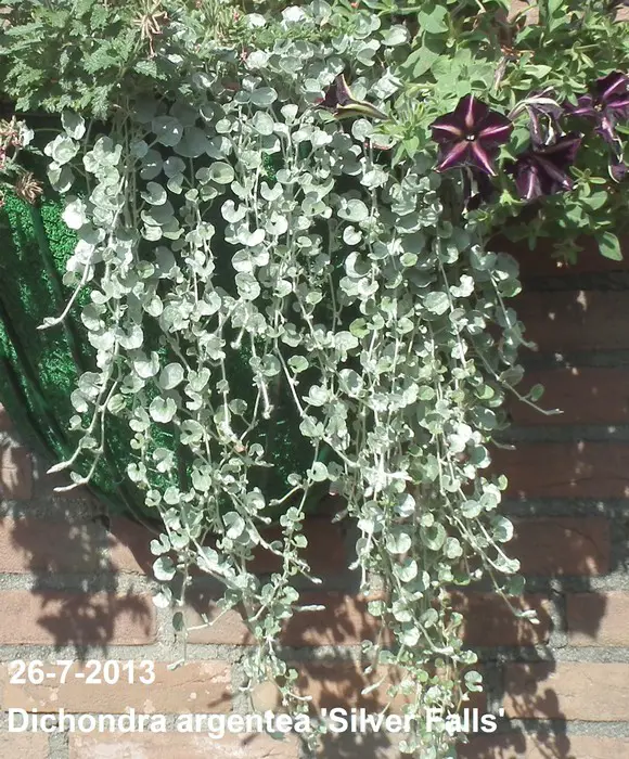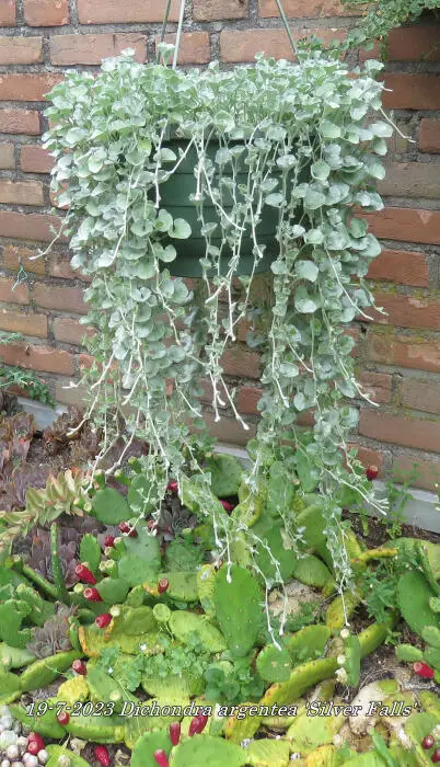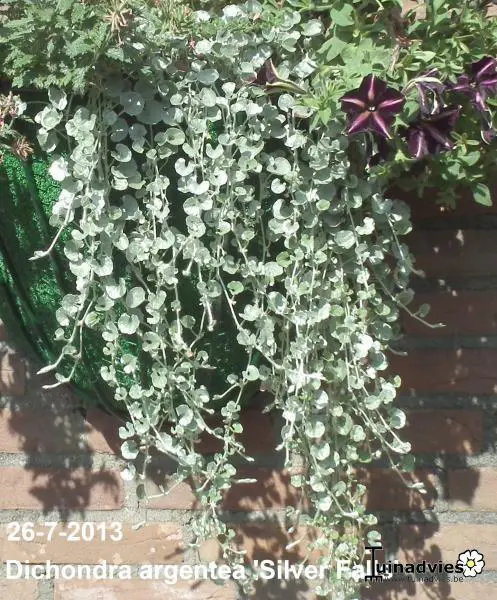 Dichondra argentea 'Silver Falls' est un couvre-sol (H5 cm) mais peut aussi être utilisé comme plante suspendue.