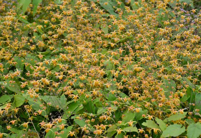 L’épimedium forme des feuilles attrayantes en forme de cœur. Selon l’espèce, elles poussent vertes ou rouges, prennent une couleur rouge d’automne et sont feuillues ou sempervirentes.