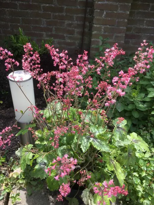 × Heucherella 'Pink Revolution' produit des feuilles vertes très attrayantes, profondément incisées, avec une lueur argentée. En été, les nervures des feuilles deviennent rouges.
