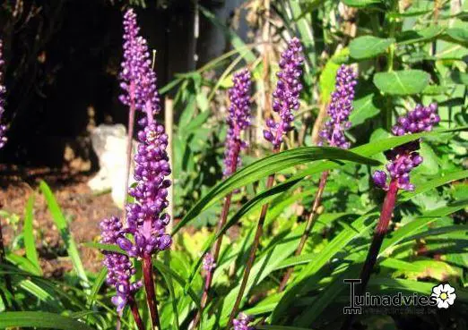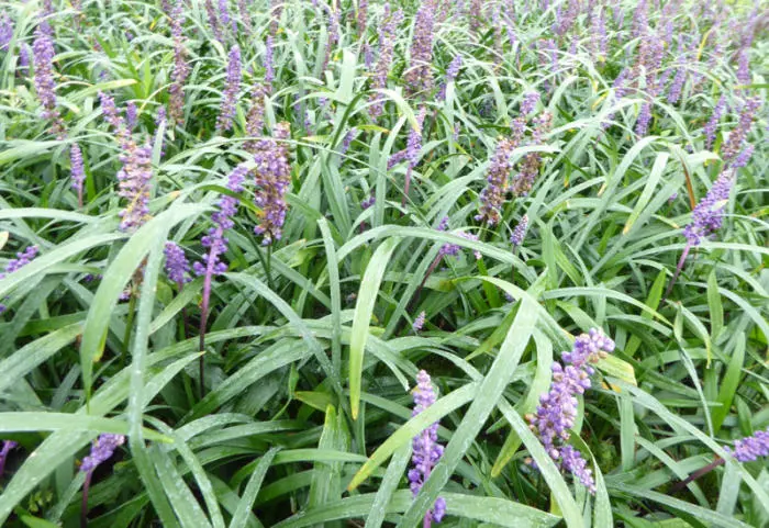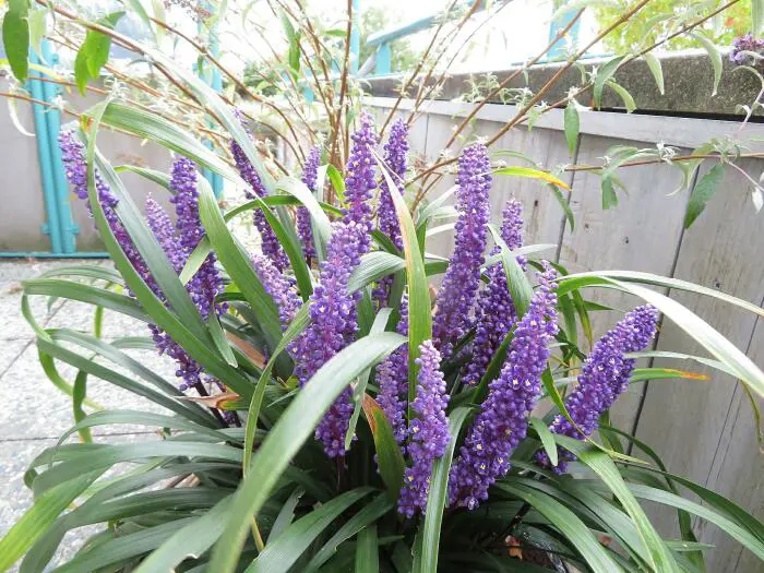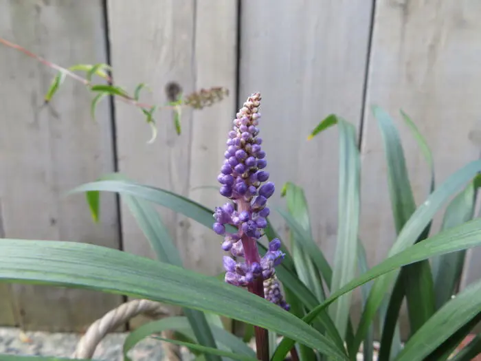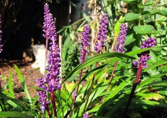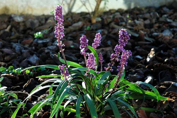Liriope muscari 'Royal Purple' est une magnifique plante bordure aux feuilles persistantes semblables à de l’herbe et aux épines florales violettes intenses aux tiges foncées.