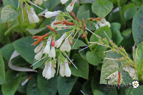 Symphytum ibiricum* est originaire d’Afrique du Nord et d’Asie occidentale, forme une large plante touffue aux feuilles vertes ovales, fleurissant avec des fleurs tubulaires jaune clair/blanc crème.