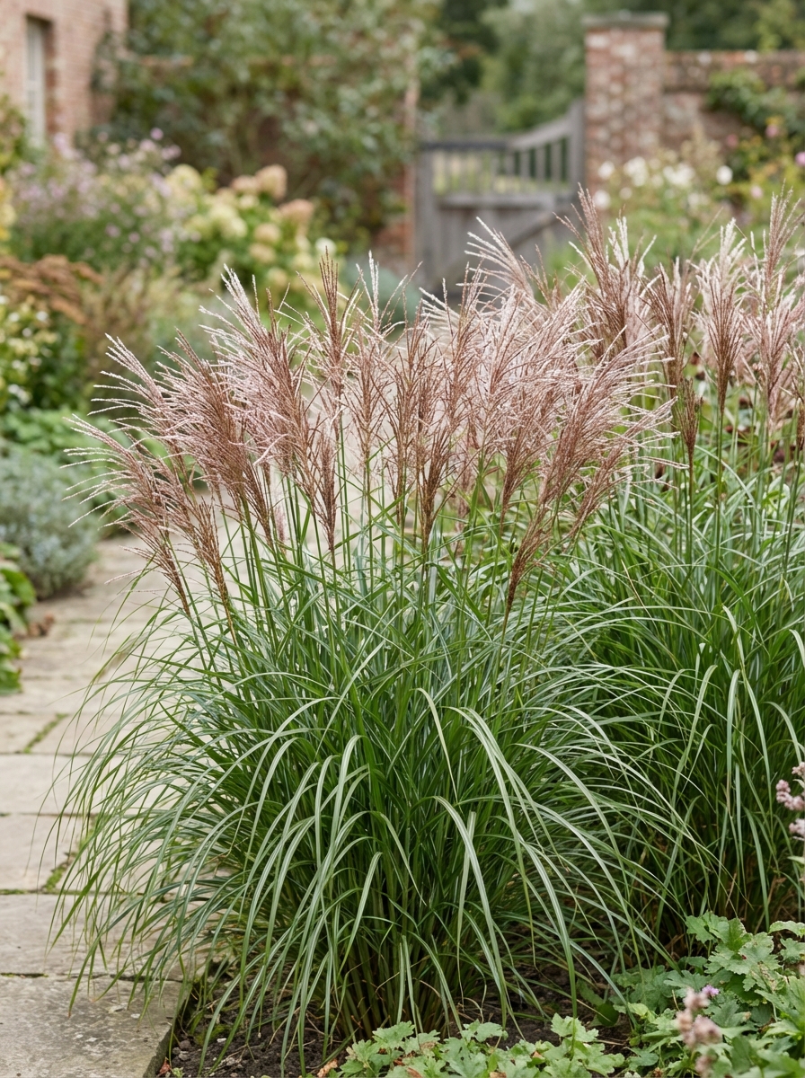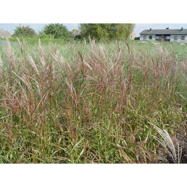 Miscanthus sinensis 'Ghana' a des feuilles brun-rouge qui prennent une belle teinte rouge cuivrée à l’automne.
