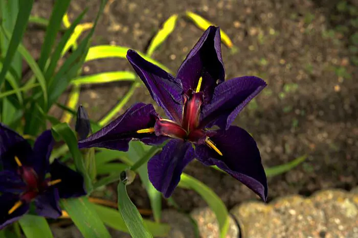 Iris x Louisiana 'Black Gamecock' fleurit avec des fleurs veloutées violet-noir avec une bande jaune doré sur les sépoles.