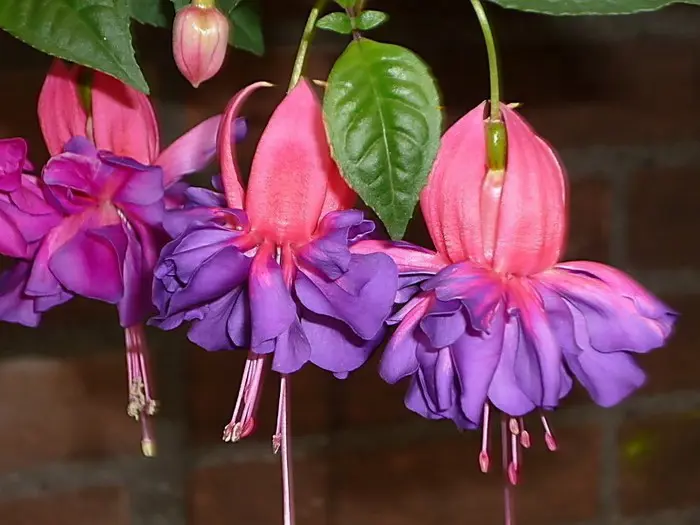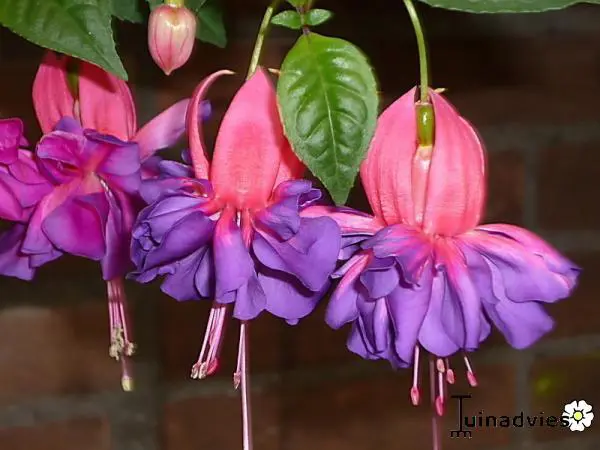 La fuchsia 'Rose Bradwardine' est une plante dressée qui fleurit avec des fleurs en forme de cloche, la double couronne est bleu-violet avec des sépales violet-rouge.
