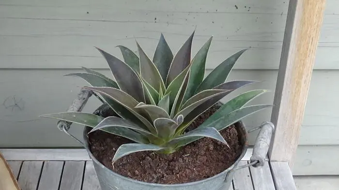 Cette « Lavender Lady » est très compacte et possède une feuille qui évolue du vert amande, finement poudré de rose, à un gris foncé et bleu-vert, bordé de petites épines blanches fines. Chaque feuille a une pointe brun cannelle.