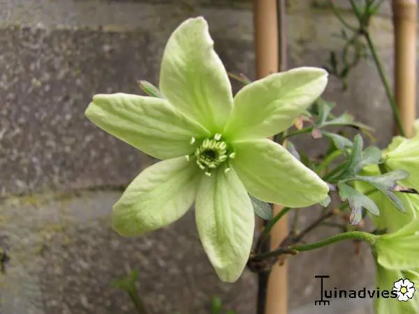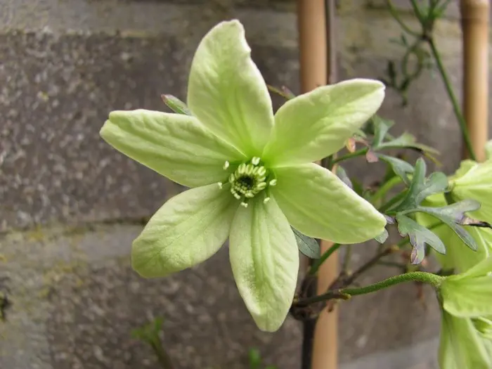 Clematis 'Pixie' est une clématite persistante du groupe Forsteri avec de petites fleurs verdâtres-blanc.