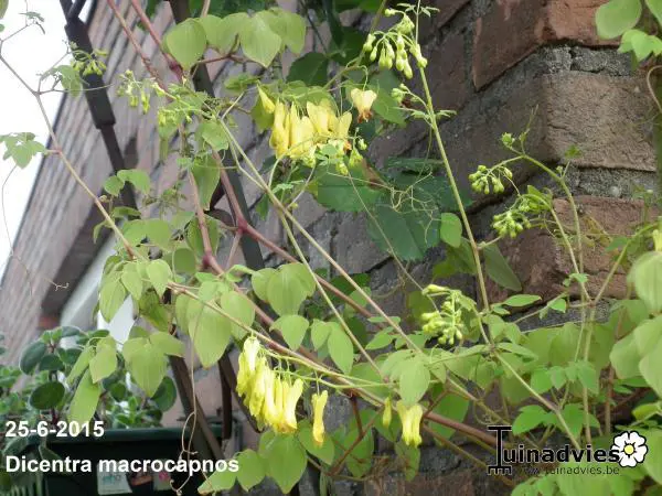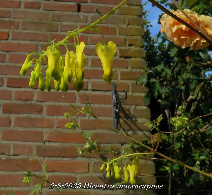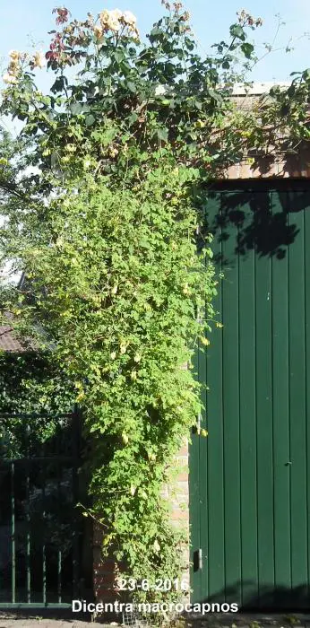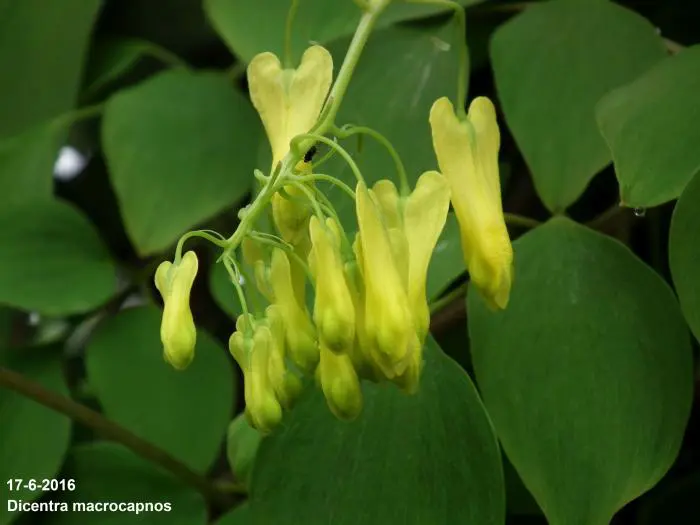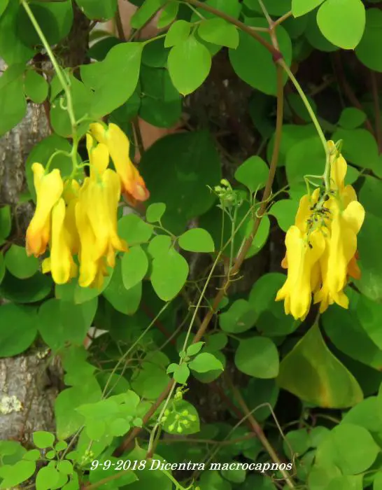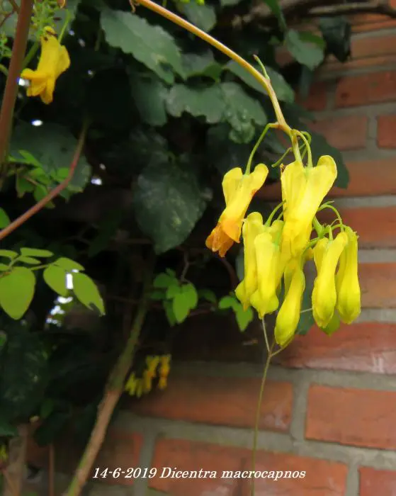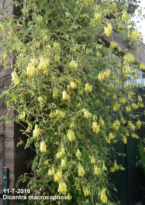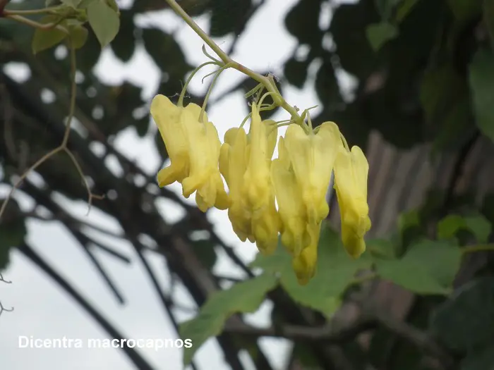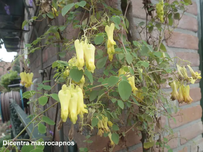Dicentra macrocapnos est un cœur brisé grimpant avec des feuilles gris-vert semblables à des fougères et de grandes fleurs en forme de cœur jaune éclatant.