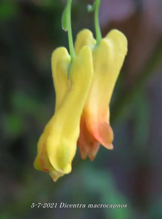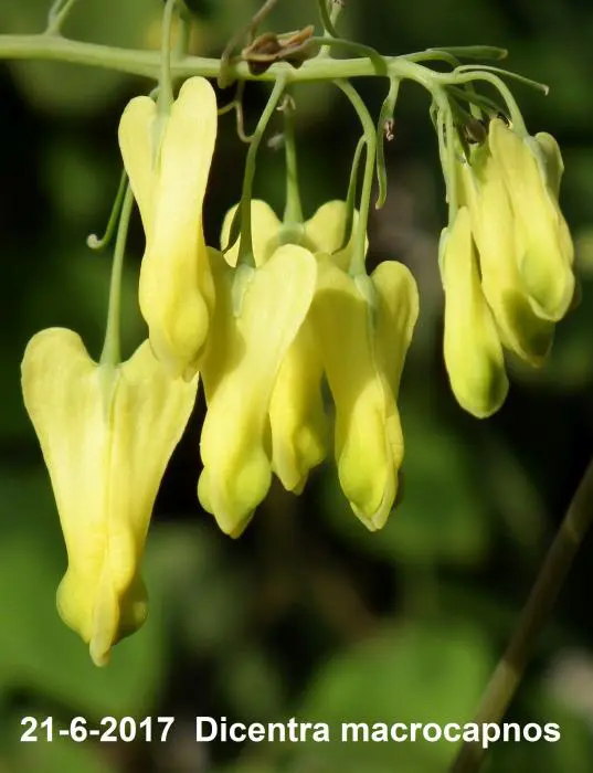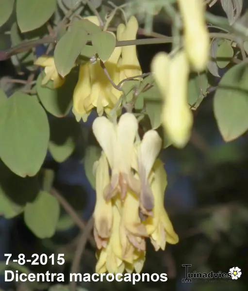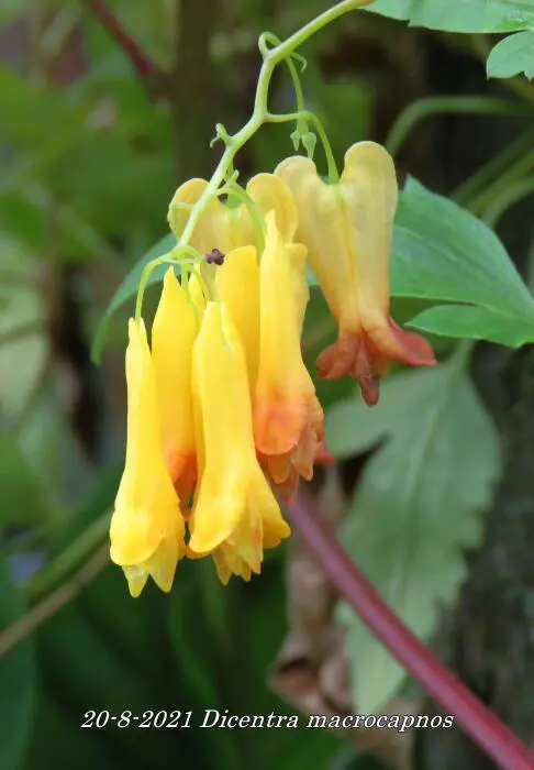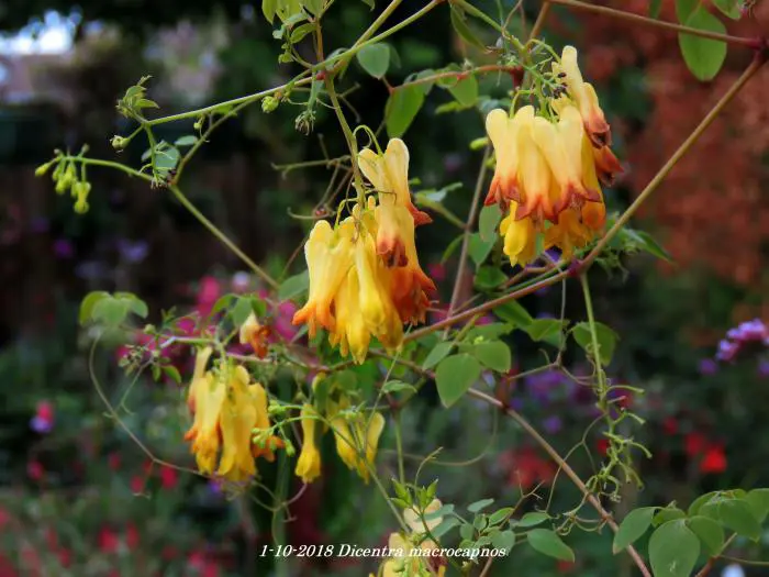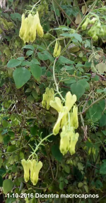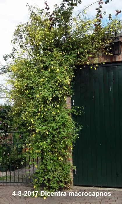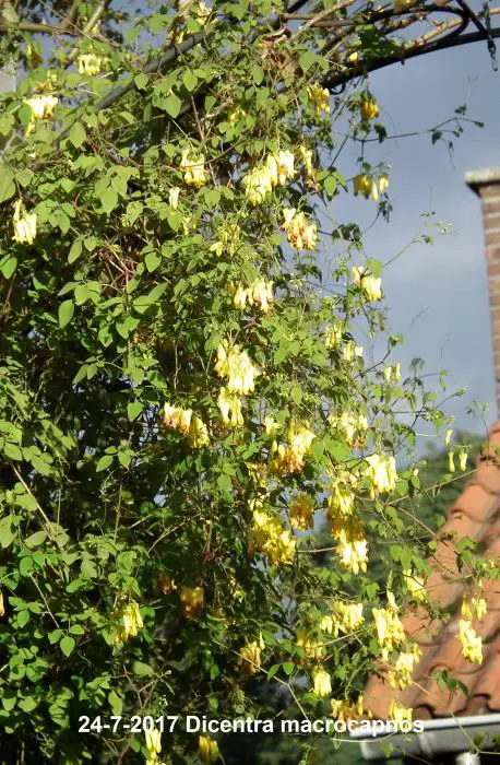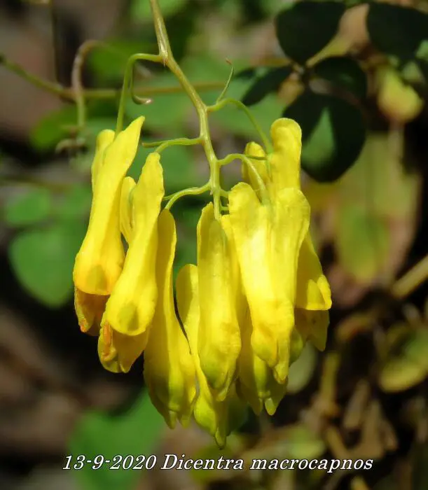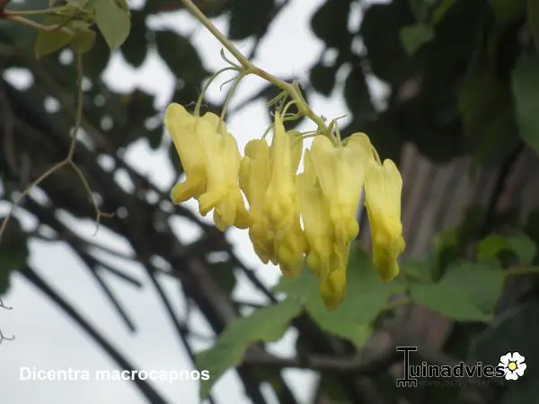 Dicentra macrocapnos est un cœur brisé grimpant avec des feuilles gris-vert semblables à des fougères et de grandes fleurs en forme de cœur jaune éclatant.