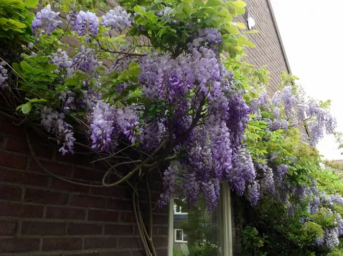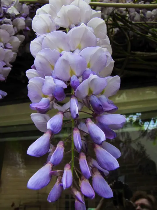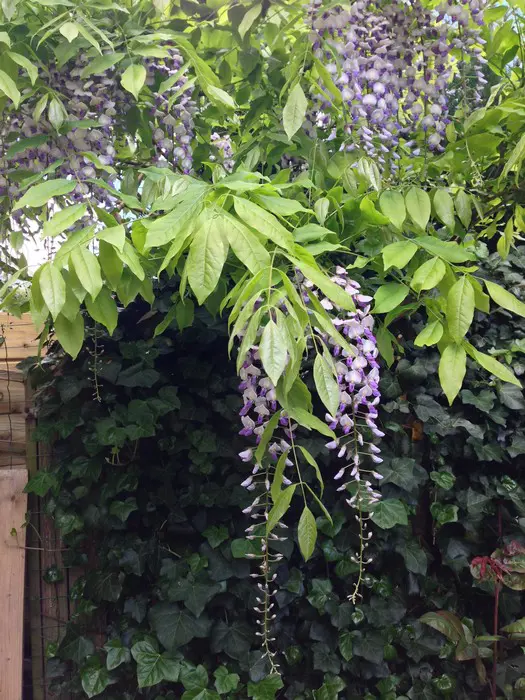 Cette glycine américaine est gauchère et pousse moins haut (+/- 4 m), dont les grappes de fleurs sont également plus compactes (18 cm).