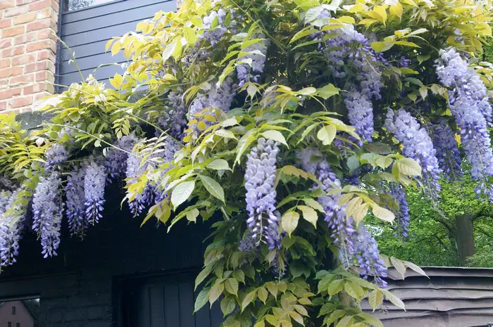 Chez la plupart des variétés de glycine sinensis, les fleurs fleurissent avant que les feuilles ne germent. Après la floraison, de longues feuilles pinnées apparaissent, passant au bronze au vert clair en été.