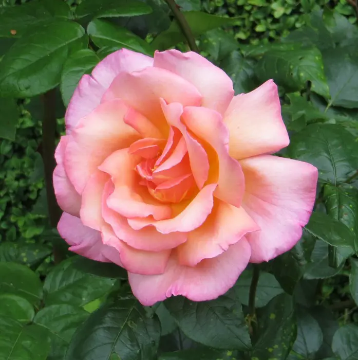 Rosa 'Compassion' est une rose en pleine floraison, avec de grandes fleurs très parfumées, bien doublées, magnifiquement formées, en abricot, cuivre, jaune et rose.