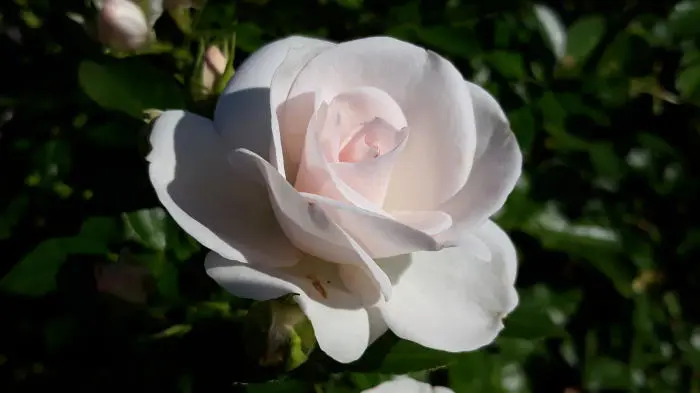 Rosa 'Constanze Mozart' est une rose à floraison fortement parfumée avec des fleurs blanches crèmes et bien remplies en forme de coupe.