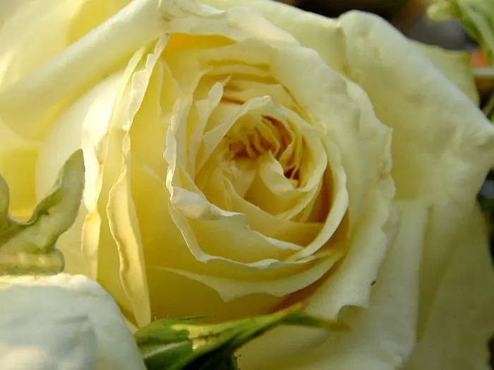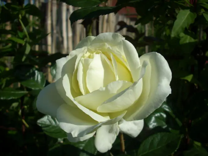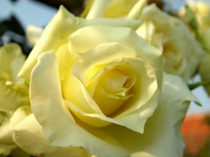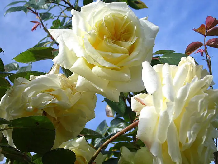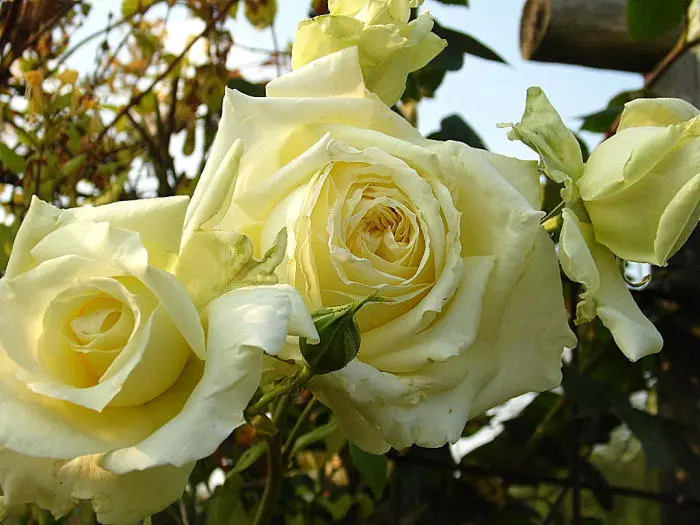 Une rose grimpante à floraison continue avec des fleurs jaune verdâtre clair.