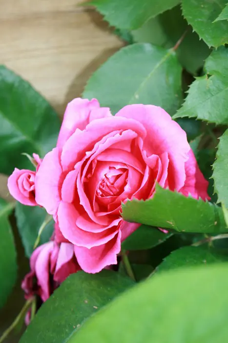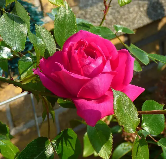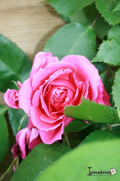 Fleurs avec de grandes fleurs fuchsia, épaisses et doubles, sur des branches souples. Légèrement parfumé mais résistant aux maladies.