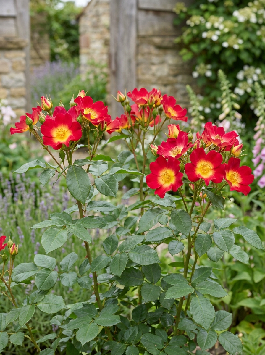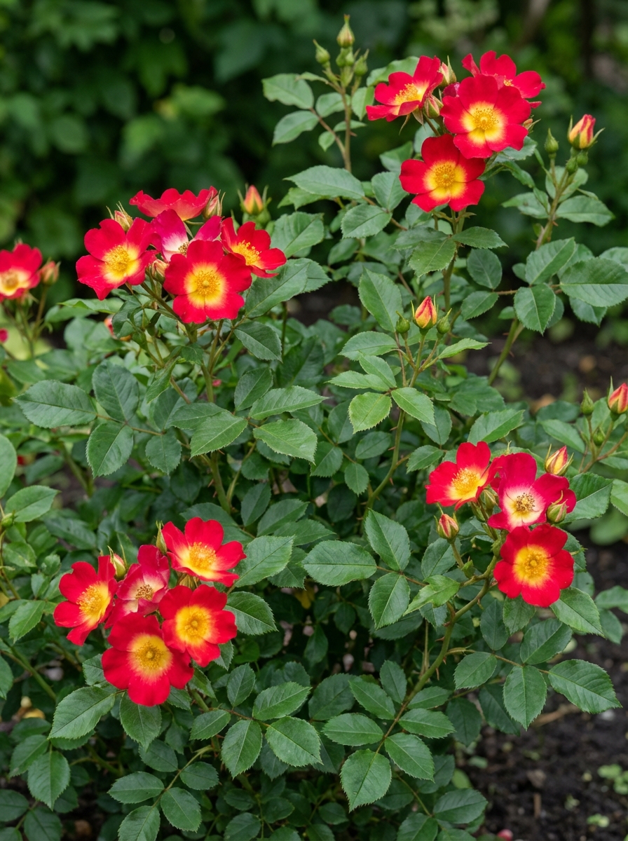 Rosa 'Summer of Love' est une rose bien refleurie avec des fleurs simples à semi-doubles. Les fleurs sont jaunes avec de larges bords rouge cerise.
