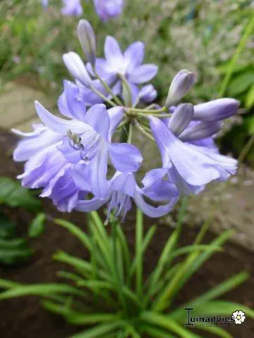 Agapanthus 'Newcastle' possède des feuilles en forme de ceinture et fleurit abondamment avec des umbelles rondes de fleurs en forme de trompette violet-bleu clair sur des tiges vertes robustes.