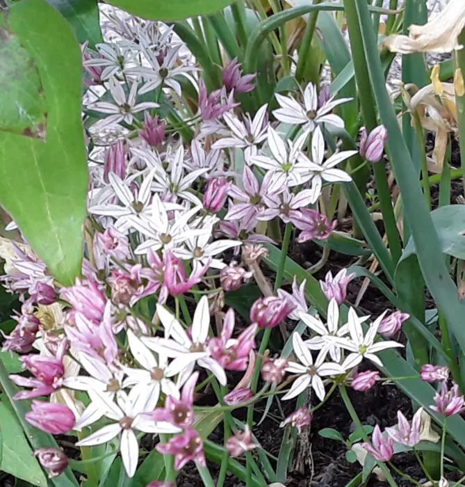 Allium drummondii est une plante bulbeuse aux feuilles aromatiques semblables à des herbes et à des têtes florales sphériques lâches (ø 10 cm) de fleurs blanches ou rose pâle en forme d’étoile.