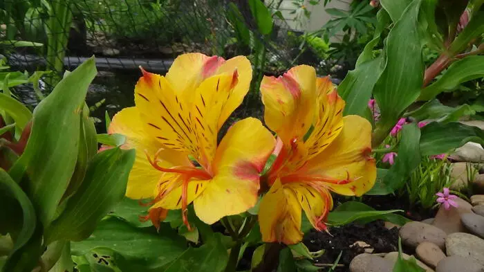 Alstroemeria 'Nicolas' fleurit avec des fleurs jaunes chaudes semblables à des lys, avec des extrémités roses lilas et de fines rayures châtain dans la gorge.