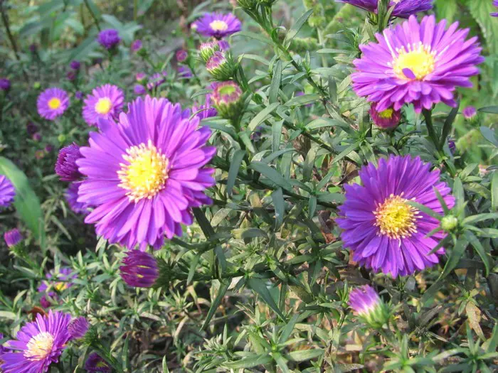 Des fleurs avec des têtes relativement grandes, légèrement remplies d’un violet-bleu, avec un centre jaune.