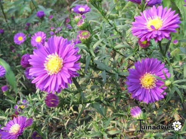 Aster alpinus 'Dunkle Schöne' est une petite couvre-montagne et solière compacte, vivace mais éphémère, avec des feuilles vert lancéolées.