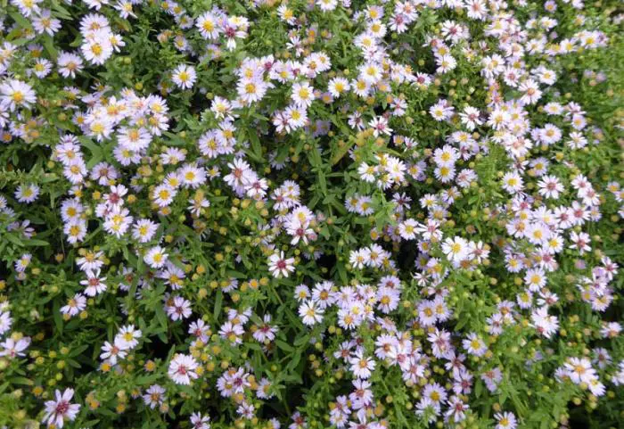 Cet aster reste attrayant même en dehors de la floraison de la fin de l’été grâce à ses petites feuilles lancéolées vert foncé soutenues par des tiges fines.