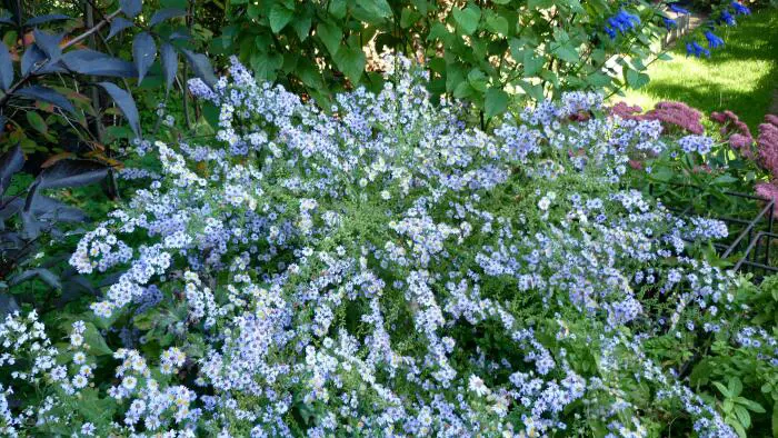 Aster ericoides 'Blue Star' Aster ericoides 'Blue Star' est une variété assez compacte avec un habit en proplombation de panicules abondantes de petites fleurs lavande-bleu clair avec un centre brun.