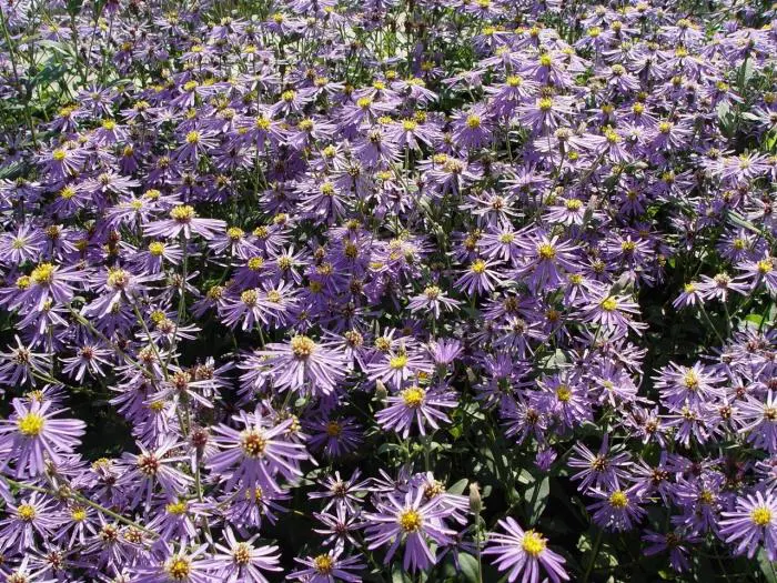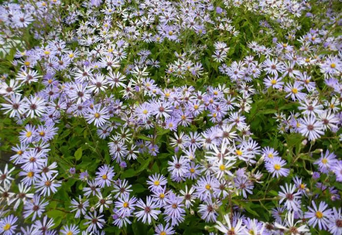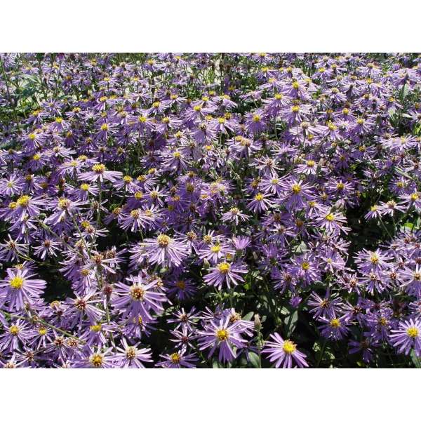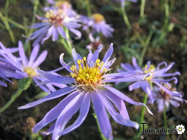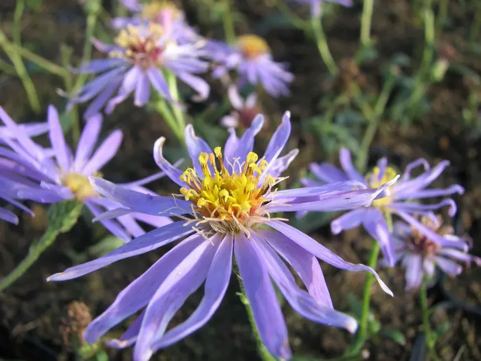 Sur les tiges fines et droites et violettes éclosent les panicules de fleurs lavande-bleu semblables à des marguerites avec un centre jaune doré.