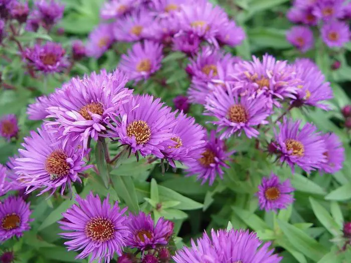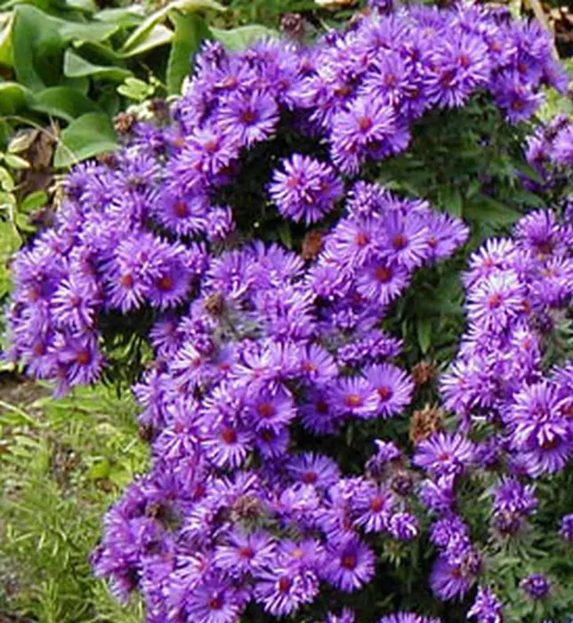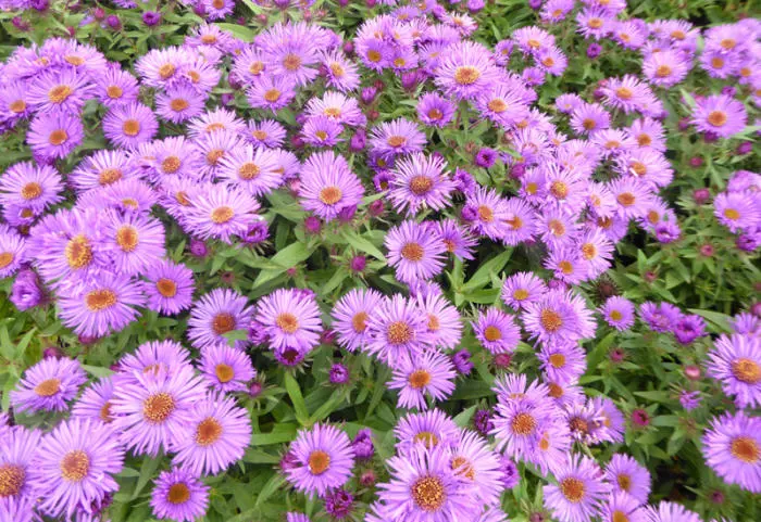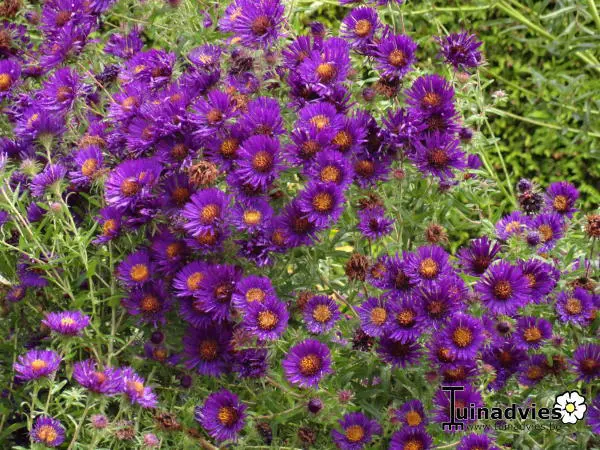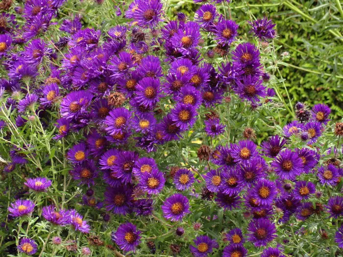 Elle fleurit abondamment à l’automne avec des têtes de fleurs lilas-pourpres à violettes avec de fins pétales autour d’un centre jaune doré.