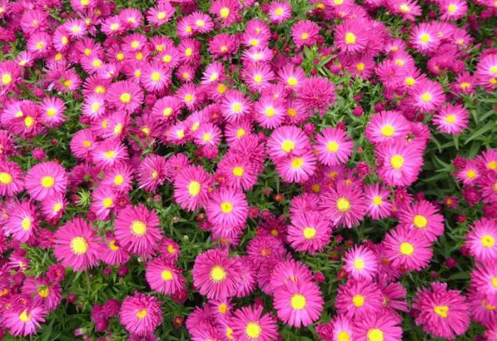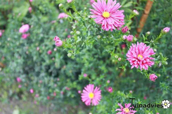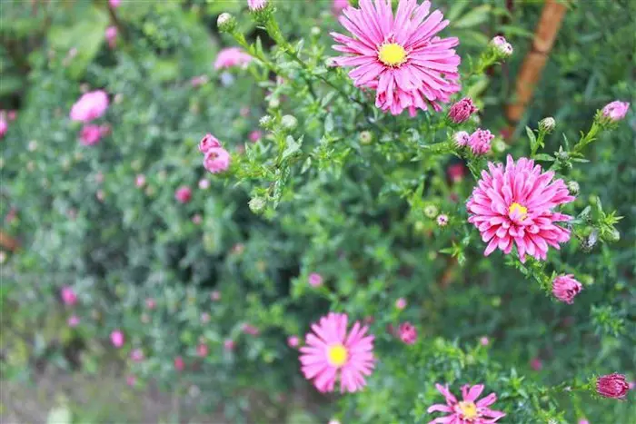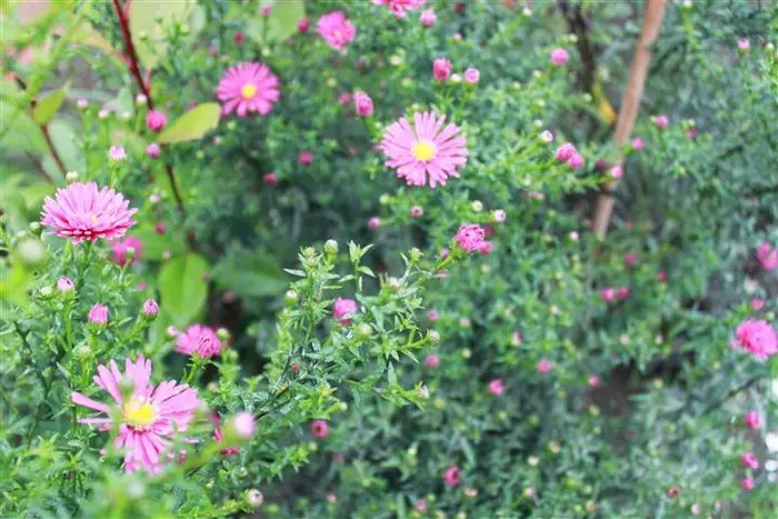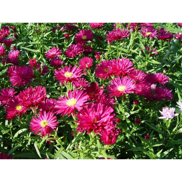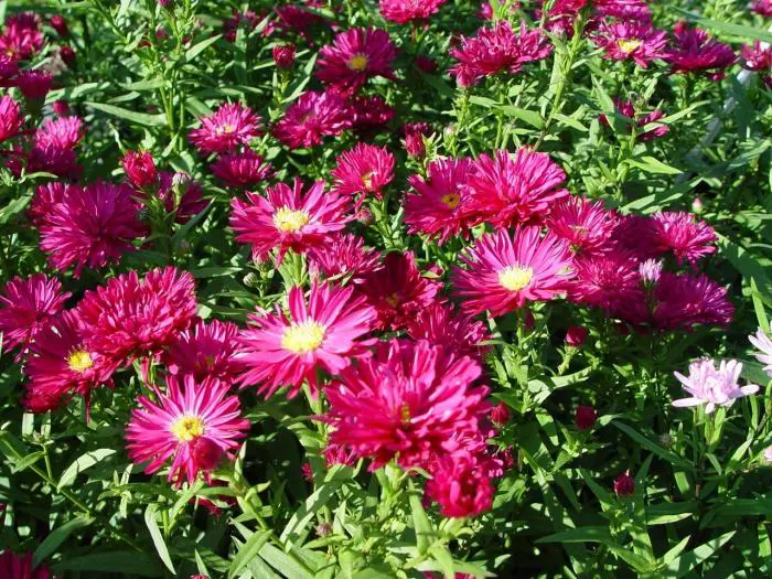 Aster novi-belgii 'Crimson Brocart' est une vivace vigoureuse et droite, avec des tiges fines et ramifiées et des feuilles fines, lancéolées, vert foncé.