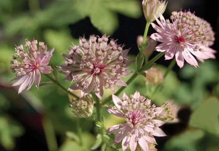 Astrantia major 'Primadonna' fleurit avec des fleurs rose doux entourées de bractées argent-rose pâle.