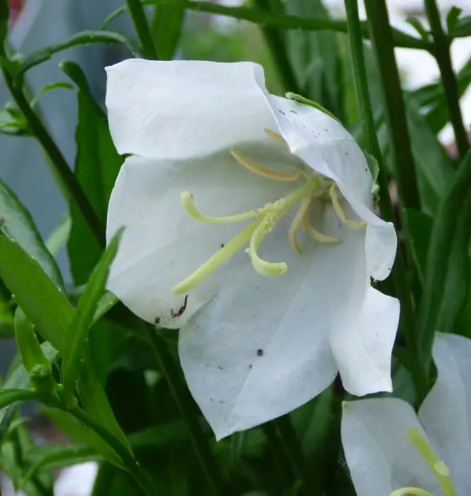 Campanula persicifolia 'Takion White' est une plante compacte de la série Takion avec des fleurs blanches en forme de coupe, mais une fleur pointant vers le haut et vers l’extérieur.