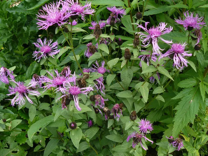 Centaurea 'Caramia' fleurit avec des têtes florales lâches d’un teint violet-rose sur des tiges droites.