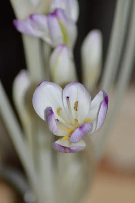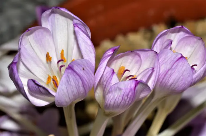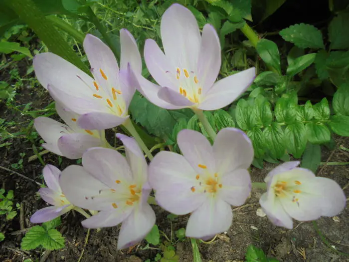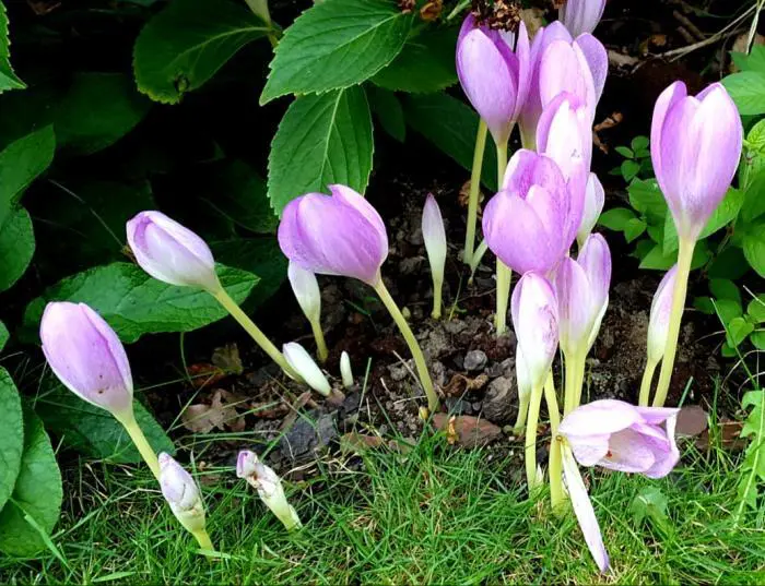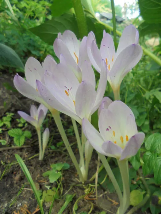 Colchicum autumnale 'Major' est un thym d’automne à floraison précoce avec plusieurs fleurs à veines blanches et lilas-roses.
