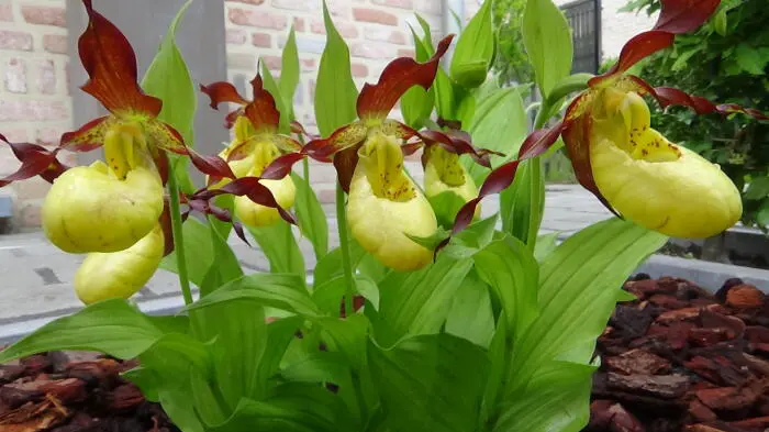 Les sépales et pétales sont brun verdâtre mais peuvent aussi être très brun foncé, la chaussure allant du jaune clair au jaune vif foncé.