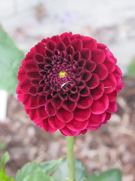 Dahlia 'Natal' est un dahlia à fleurs pompon richement fleuries, avec de petites fleurs sphériques d’un rouge violet foncé.