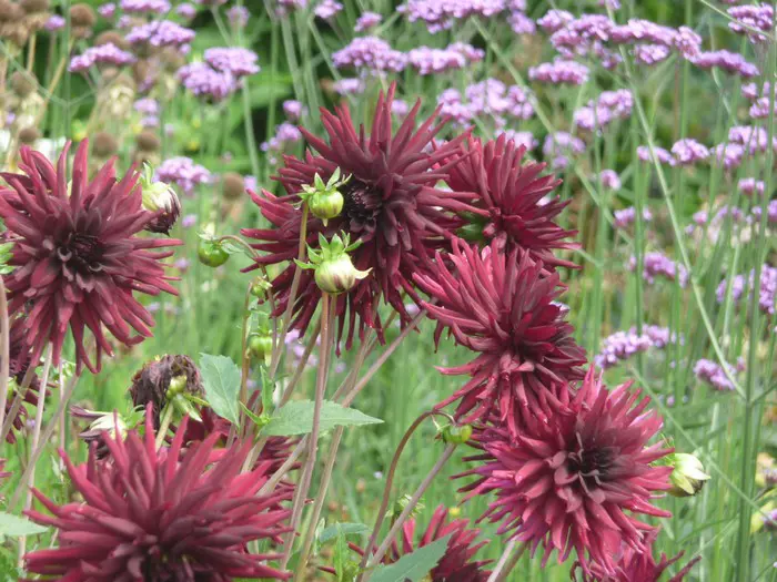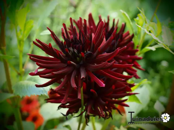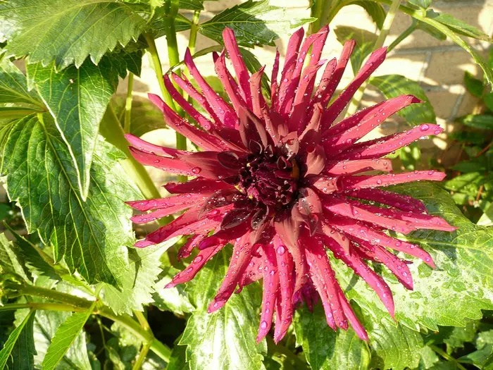Le dahlia 'Nuit d’Eté' est de type cactus, fleurit avec des fleurs brun-rouge foncé avec un centre encore plus foncé, presque noir.
