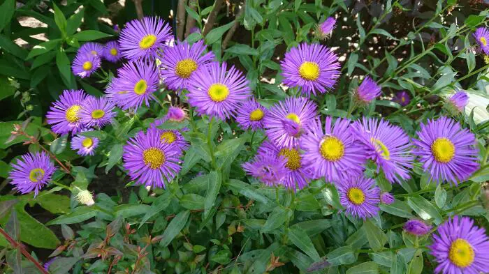 Erigeron 'Dunkelste Aller' est une vivace compacte et étendue, avec des feuilles lancéolées vert foncé et des fleurs marguerites violettes, avec un cœur jaune, du milieu du printemps à la fin de l’été.