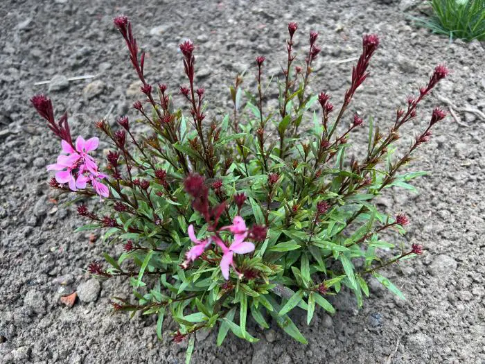 Gaura lindheimeri 'BABY BUTTERFLY Rose foncé' est une plante buissonne de courte durée avec une longue période de floraison de fleurs de papillon rose violacé foncé.