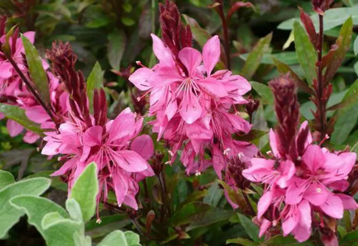 Gaura lindheimeri 'Papillons cramoisis' est une plante buissonne de courte durée de vie avec une longue période de floraison de fleurs rose foncé ressemblant à celles des papillons. Fleurir sur de longues tiges fines, se balançant au vent.