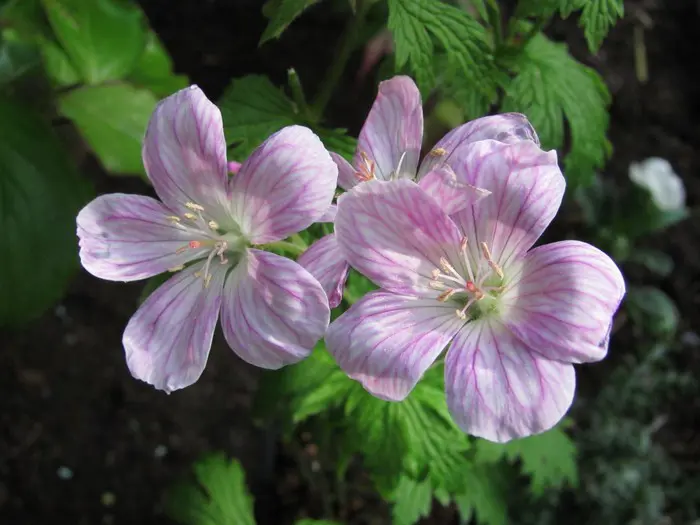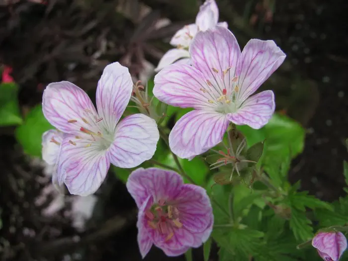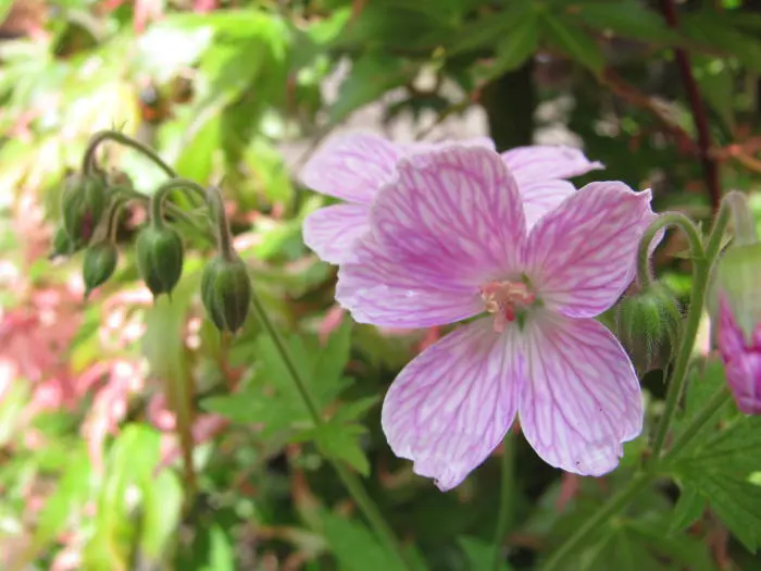 Geranium sylvaticum 'Melinda' forme une plante compacte avec des fleurs rose veineuses foncées.