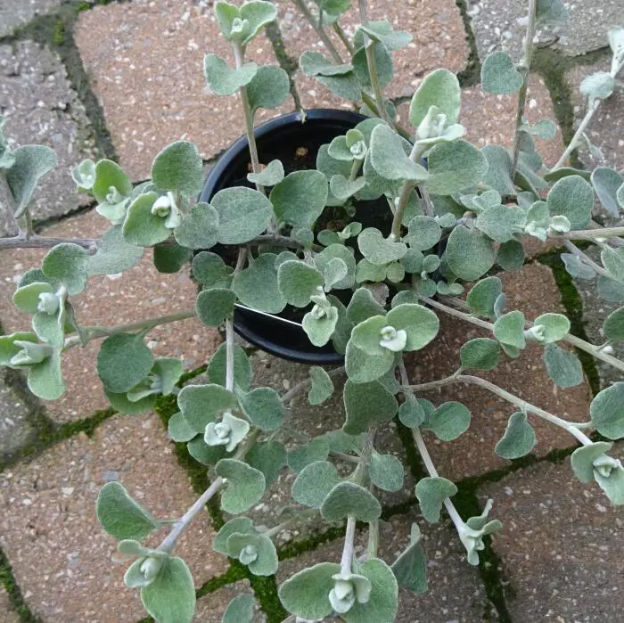 Helichrysum petiolare 'Blue Green Leaved' est une plante aromatique à feuillage avec de longues vrilles pendantes (30-35 cm) de petites feuilles grises, doucement poilues.