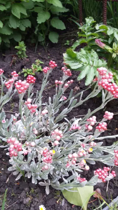 Helichrysum 'Ruby Cluster' est une vivace mais est considérée comme annuelle aux Pays-Bas. Elle forme des grappes de bourgeons rouges ressemblant à des baies entre les feuilles laineuses, poilues, argentées-gris. Les bourgeons floraux rouges s’épanouissent d’un blanc rosé à blanc, ouverts avec un centre jaune. Les fleurs ont une impression de papier.