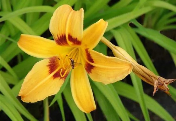 Hemerocallis 'Mikado' fleurit d’un jaune doré avec un anneau brun-rouge au centre.