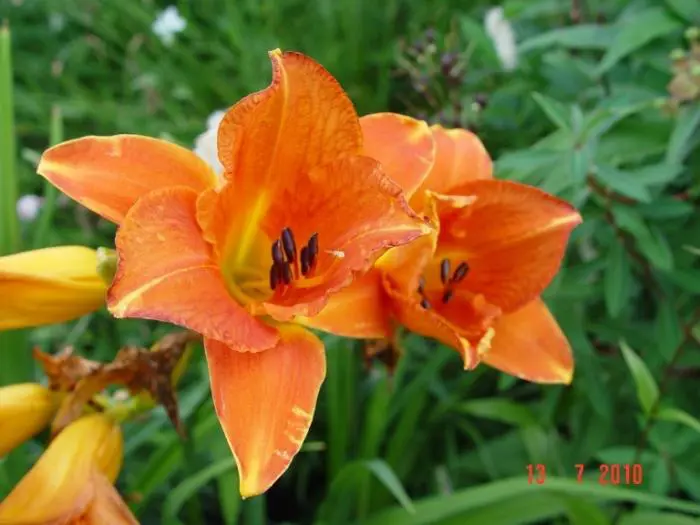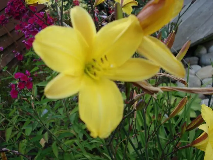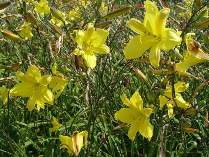 Hemerocallis 'Corky' possède des fleurs jaunes en forme de trompette avec une teinte brun-jaune sur le dos des pétales.