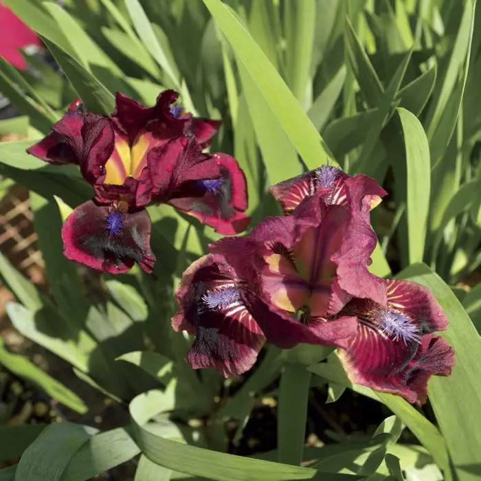 Iris pumila 'Cat’s Eye' fleurit avec de magnifiques fleurs dessinées d’un rose-rouge sur les bords, d’un rouge plus profond vers le centre avec une barbe violet-bleu.