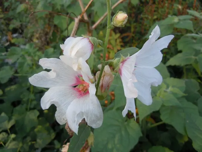 Fleurs de Lavatera 'Barnsley' 6/10, blanches avec conjonctivite